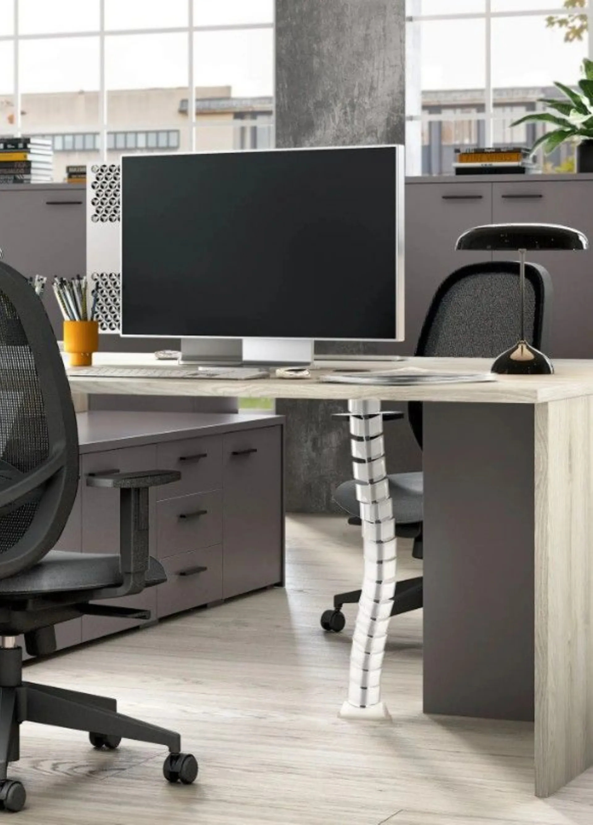 Un arredamento ufficio funzionale prevede scrivanie con gambe a L e distanziale, complete di canalina passacavi per una gestione ordinata dei collegamenti. La poltroncina operativa Hoppy assicura comfort durante la giornata, mentre il classificatore portacartelle nell’elemento componibile organizza documenti e materiali con efficienza.