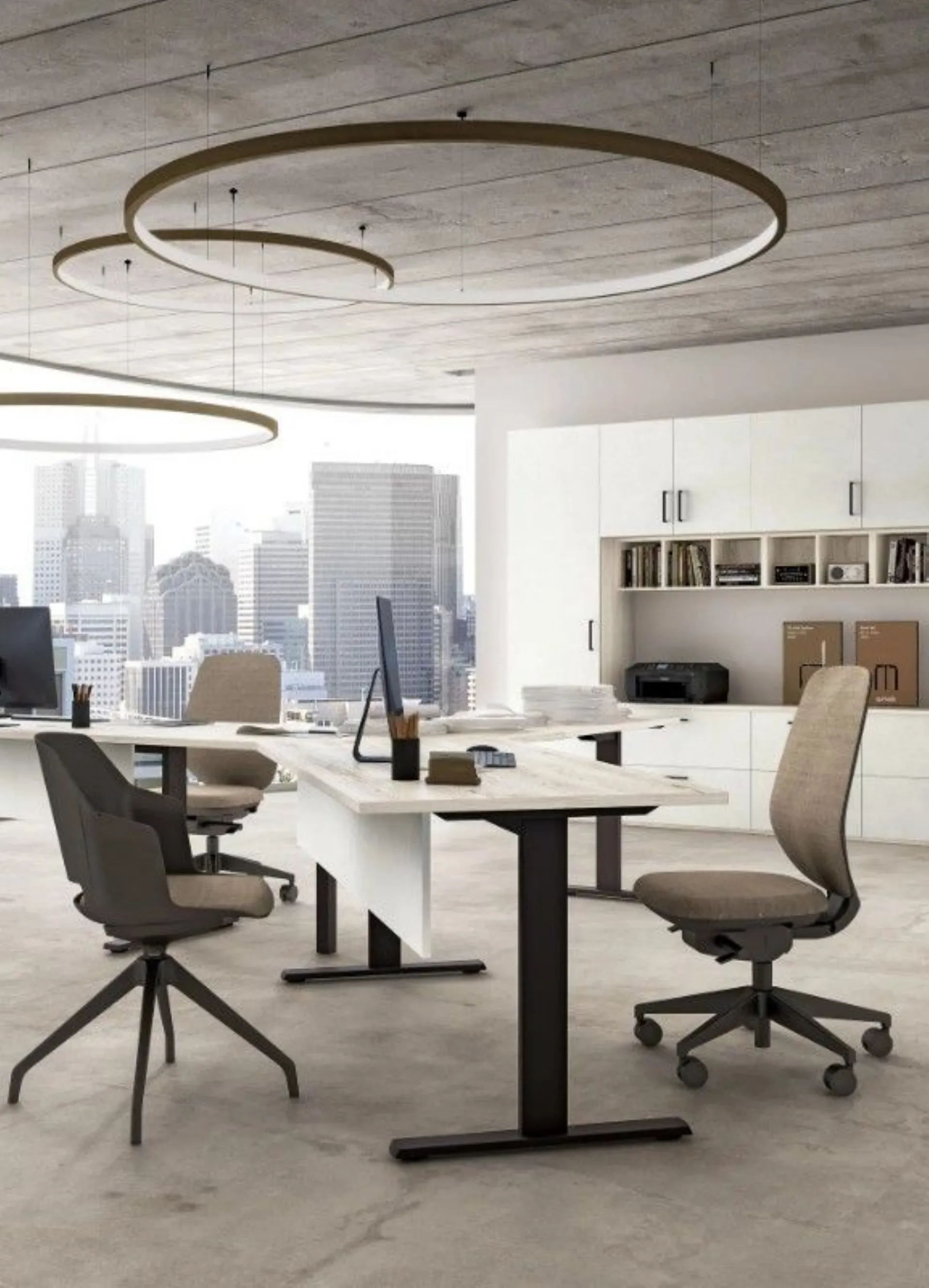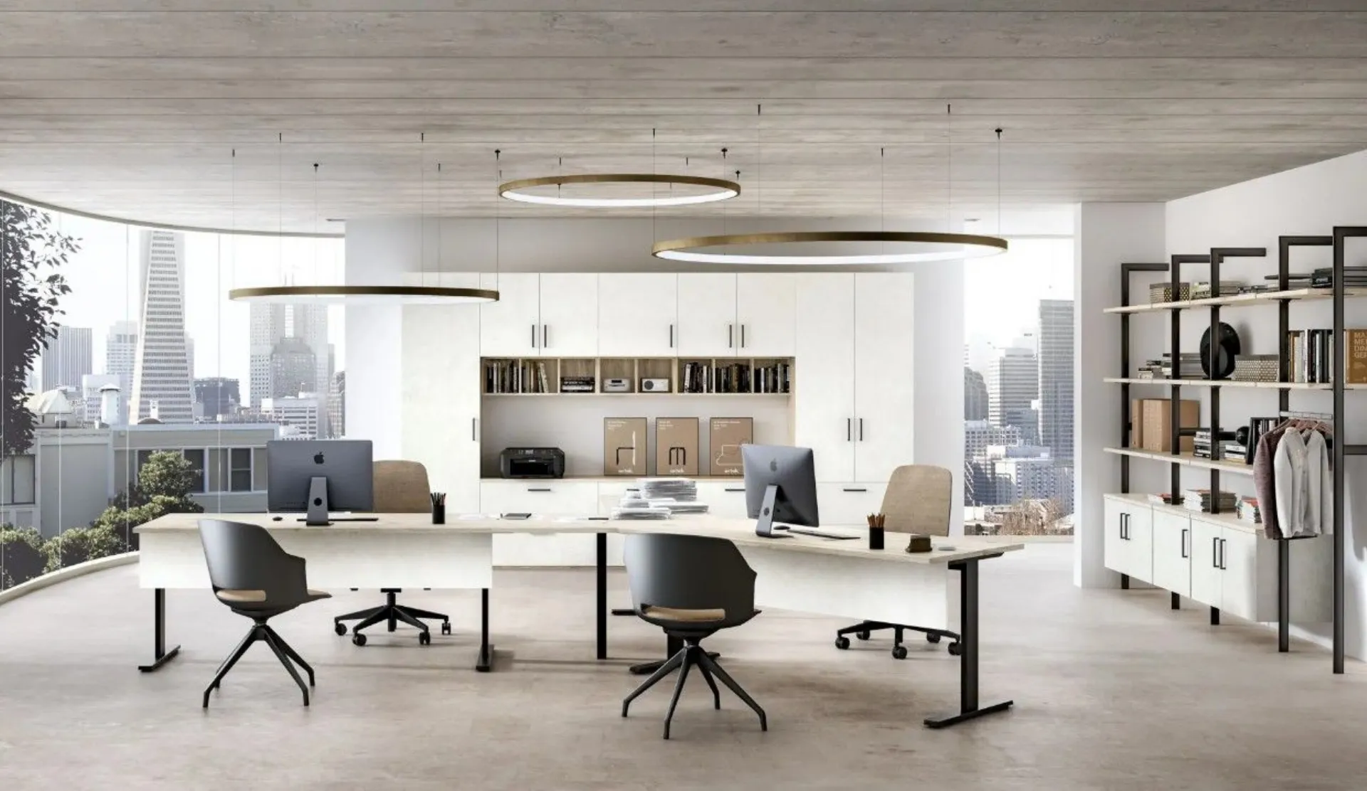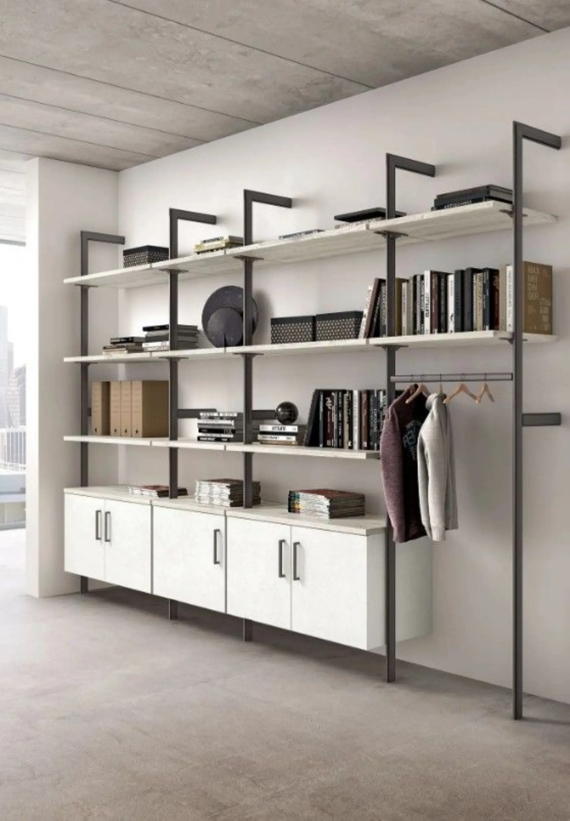 Questo arredamento combina scrivanie con gambe Syria e gonna, abbinate alla libreria Metal in alluminio con ripiani, tubo appendiabiti ed elementi sospesi, per un arredamento ufficio coerente e professionale. La configurazione crea postazioni funzionali e favorisce un design moderno, ideale per collaborare con ordine e lavorare in modo semplice ma preciso.