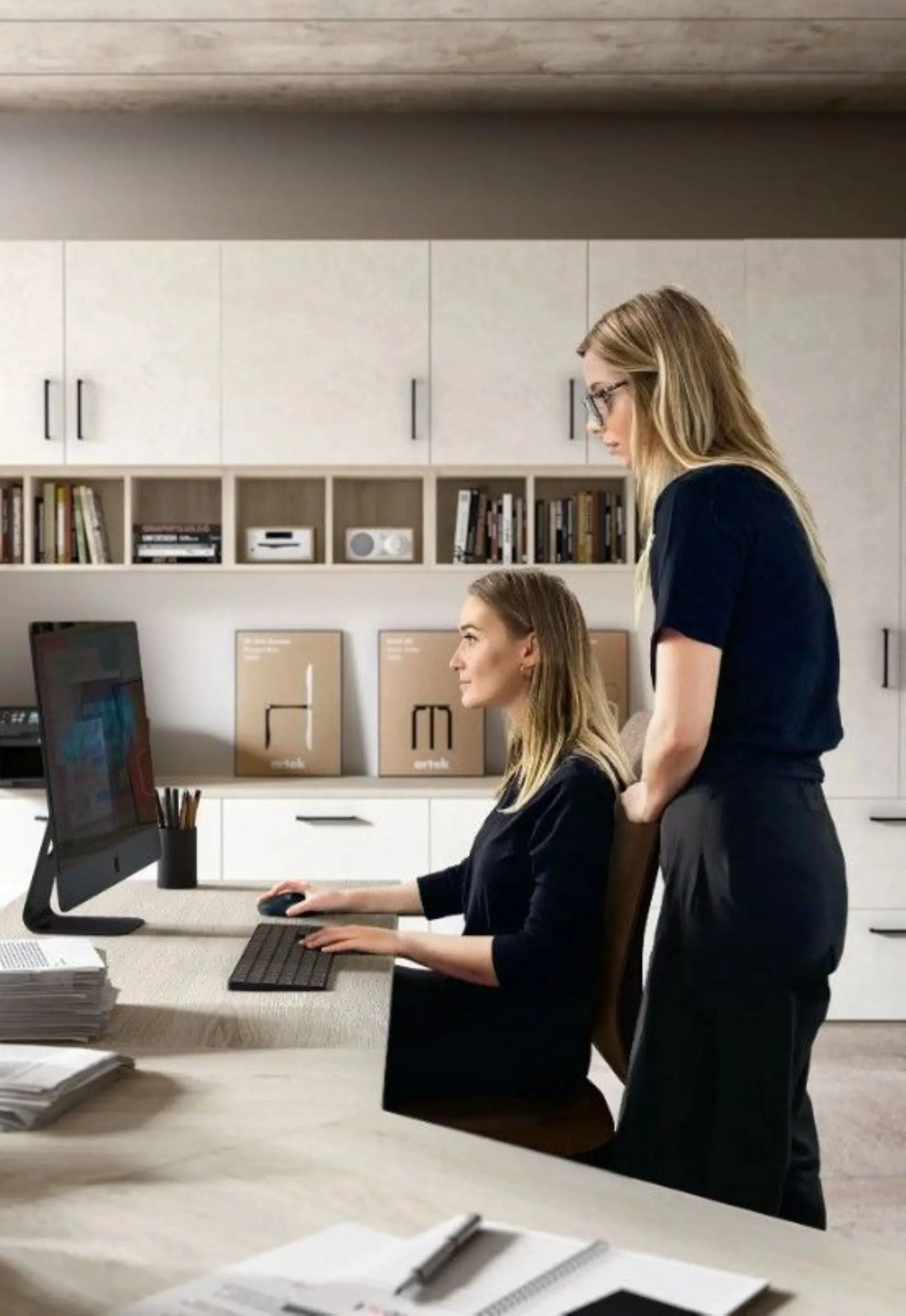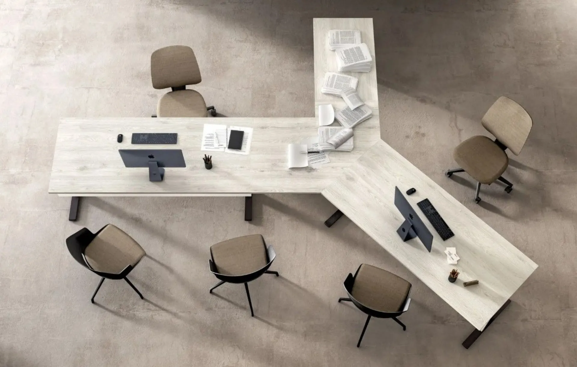 I mobili per ufficio valorizzano un ambiente ampio e curato, con due postazioni dotate di scrivanie modulari che ottimizzano lo spazio e l’organizzazione. La poltroncina Shape e le sedie Comfy assicurano comfort, mentre la libreria Metal offre capienza per documenti e materiali, creando un equilibrio tra stile e funzionalità.