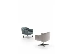 Poltroncina in tessuto di larghezza: 77cm, profondità: 82cm, altezza: 82cm. Disponibile con seduta fissa a €800,00 e con seduta girevole a €850,00. Le finiture sono a scelta e i tempi per la consegna vanno dai 40/50 giorni lavorativi.